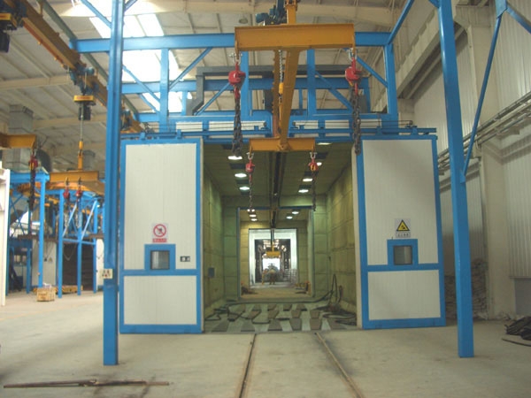 规格及特点:PLC控制,室外液晶显示器自动显示抛丸器的回转角度、高度、抛丸架和台车位置。PLC控制操作整个设备运行,点动后,只要工人注意工作情况即可,无需再去人工操作,直到工件自动走出工作室。清理工件以机械抛丸为主,人工喷丸为辅,被清理工件表面达Sa2.5-Sa3级。